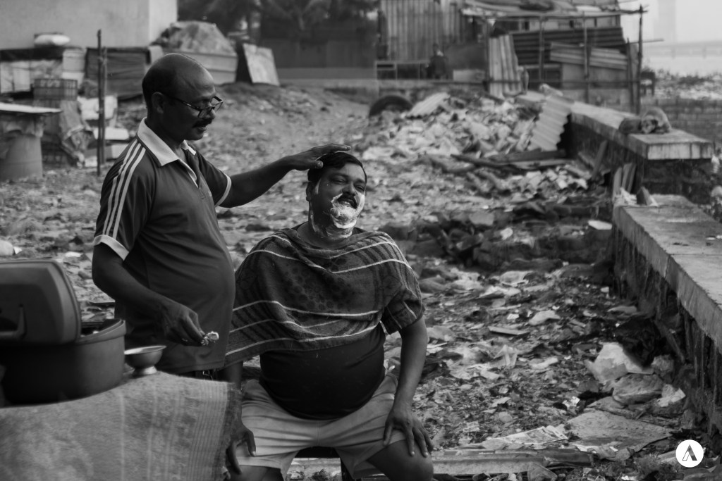 Das Foto zeigt einen Barber, der Männer rasiert. Mit Blick aufs Meer zum Sonnenuntergang. Ich finde es sehr kontrovers zu sehen, wie das Bedürfnis nach Gepflegtheit und der Wunsch nach ordentlichem Aussehen der kompletten Verschmutzung des Lebensraums gegenüber steht.